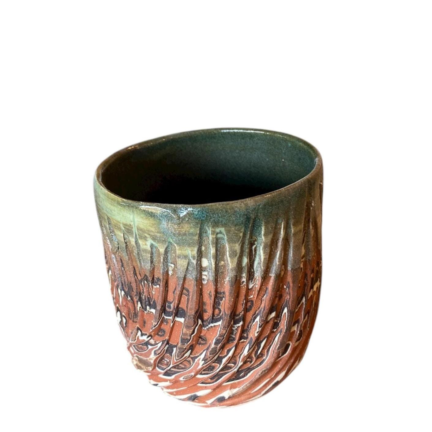 My 10-ounce stemless carved agateware cup is perfect for sipping your favorite beverage. Each cup is expertly crafted on an electric wheel from three colors of stoneware, creating a unique agate-like pattern. I make a thumbhold, then carve through the layers for a one-of-a-kind visual effect. After a first firing, I sanded the exterior with diamond sanding blocks for a smooth finish. The interior and lip are finished with a reactive sage glaze for an elegant touch.