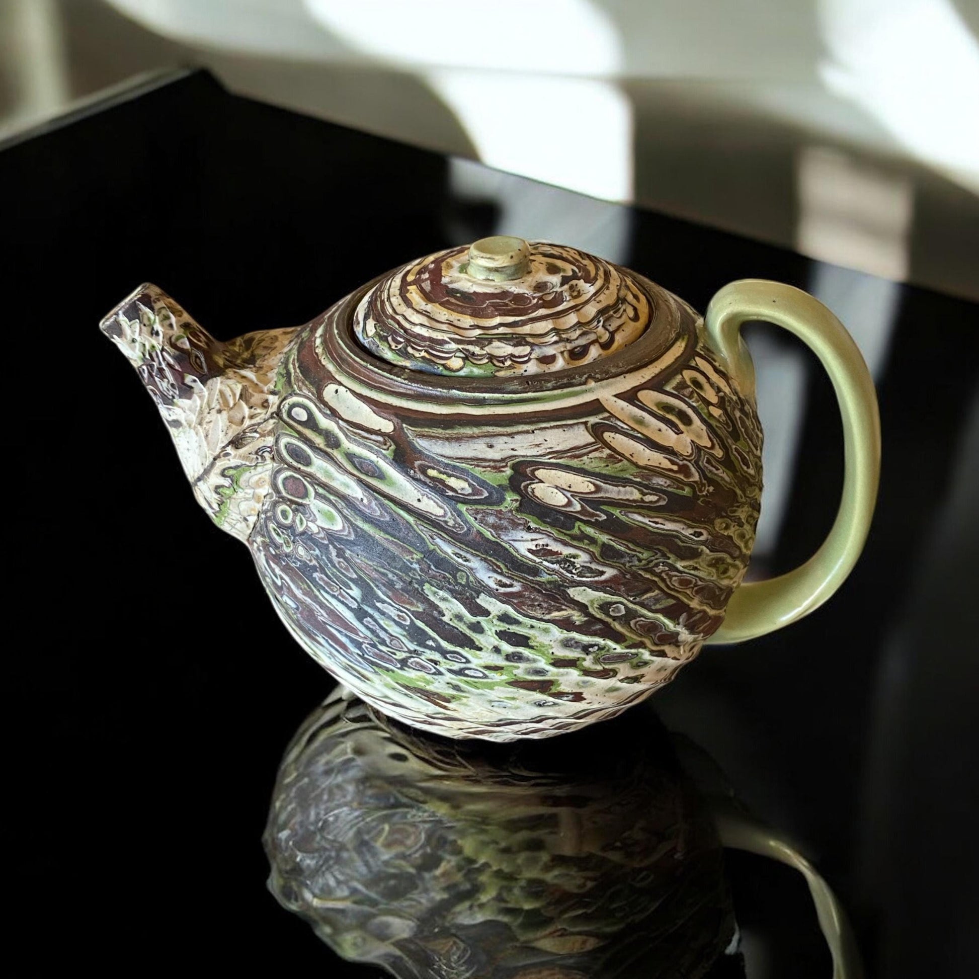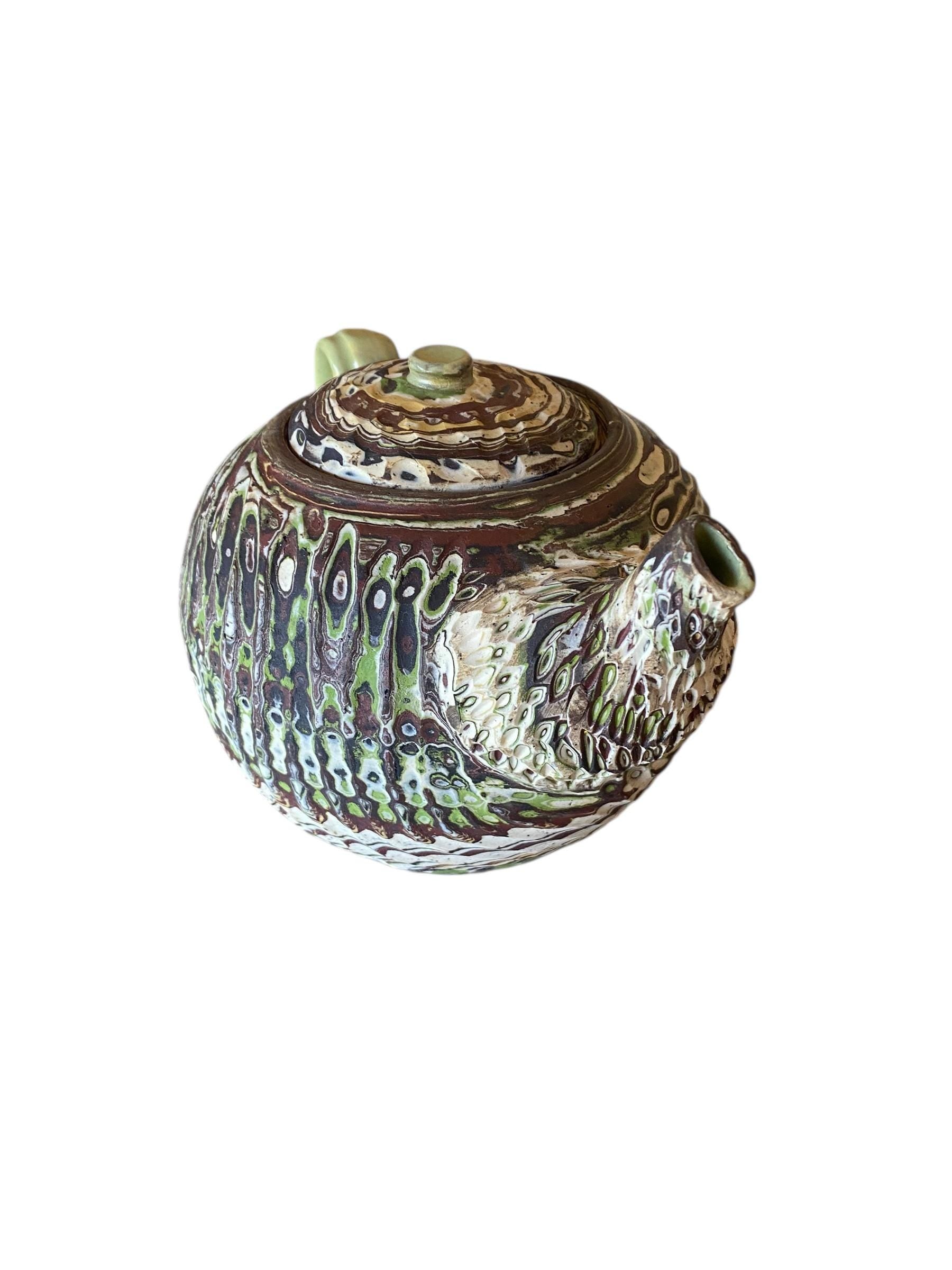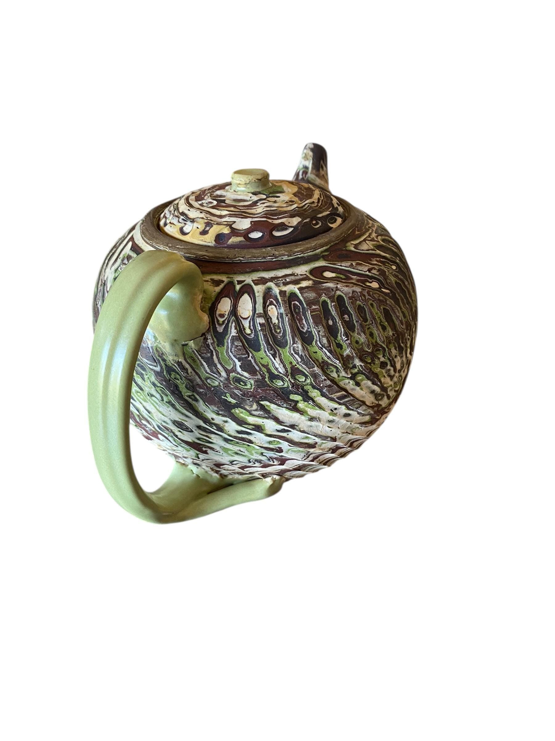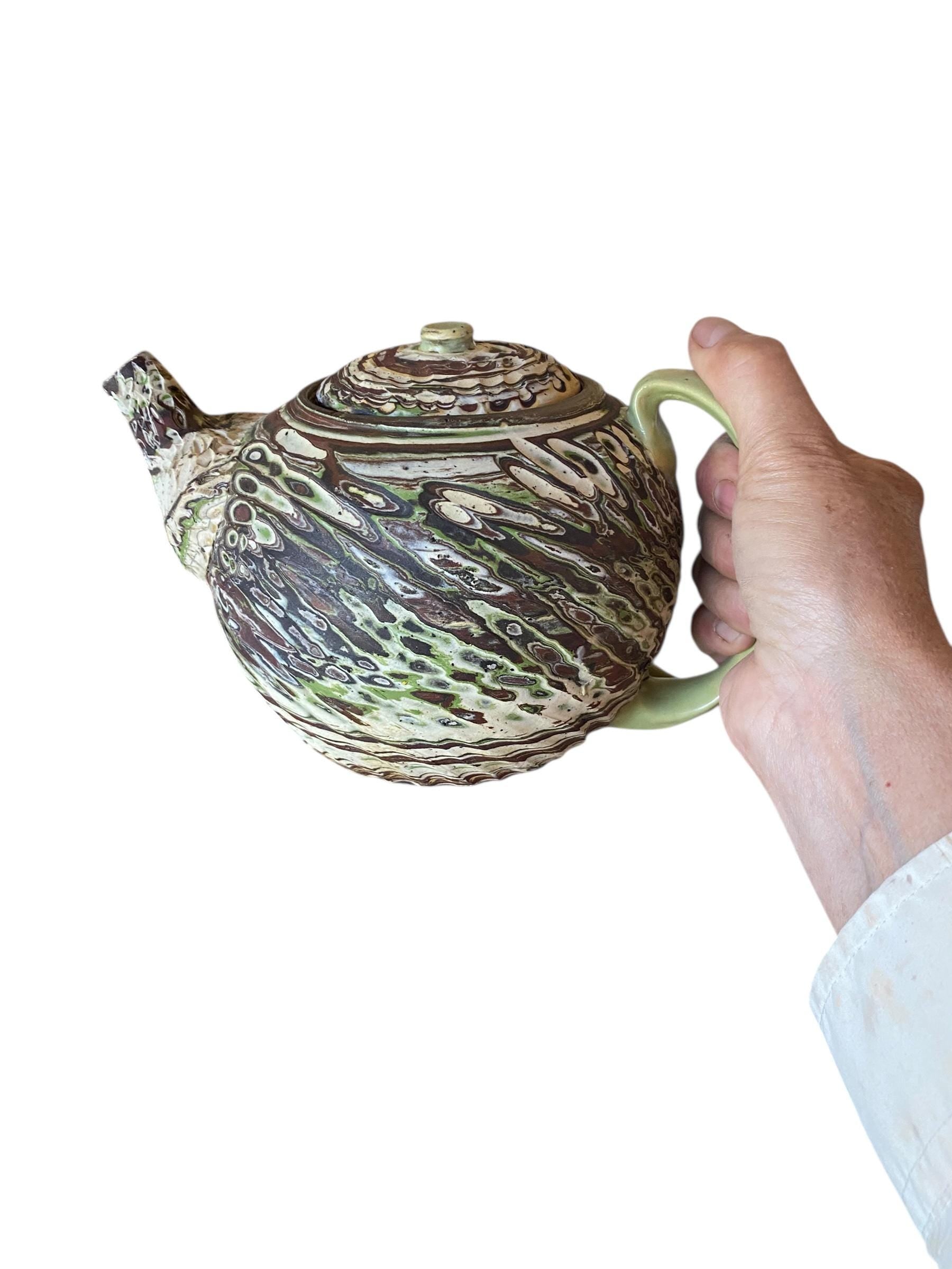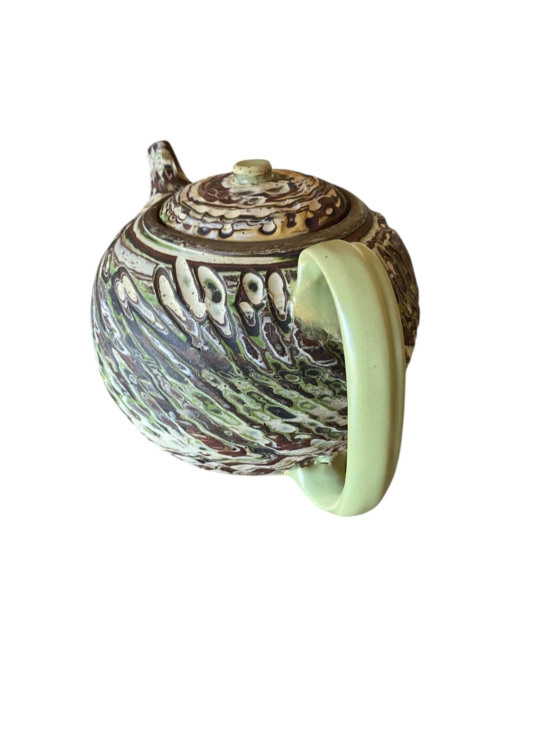 Agateware green, gold, brown, and white clay teapot glazed sating green. This handmade teapot was created on a pottery wheel in layered green, gold, brown, and white stoneware clays. The teapot is glazed in a satin green glaze. The teapot measures 6" x 8.5 (spout) and has a 3 inch circumference at the opening. It holds 4 cups of liquid.